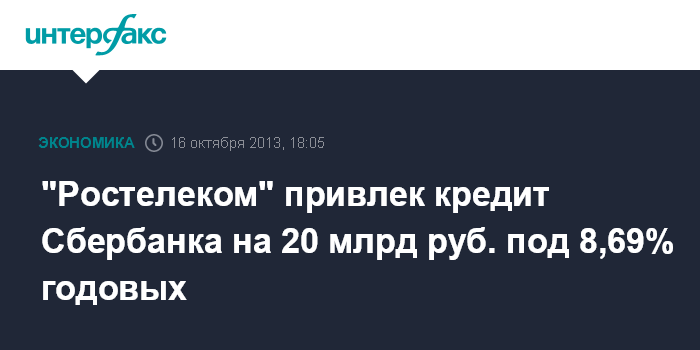 "Ростелеком" привлек кредит Сбербанка на 20 млрд руб. под 8,69% годовых