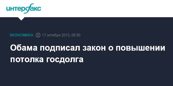 Вашингтон. 17 октября. INTERFAX.RU - Президент США Барак Обама в четверг подписал одобренный Конгрессом закон, который восстанавливает финансирование деятельности федерального правительства и повышает потолок госдолга, сообщает агентство Bloomberg.