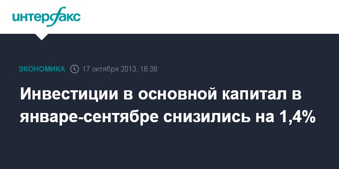17 октября. FINMARKET.RU - Инвестиции в основной капитал в России за январь-сентябрь 2013 года снизились к тому же периоду прошлого года на 1,4%, свидетельствуют данные Федеральной служба госстатистики (Росстата). При этом в январе-сентябре 2012 года был зафиксирован рост на 9,6%.