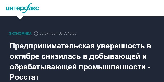 По сравнению с сентябрем в октябре индекс предпринимательской уверенности в добывающих производствах понизился на 3 процентных пункта (п.п.), в обрабатывающих - на 2 п.п., в производстве и распределении электроэнергии, газа и воды вырос на 1 п.п.