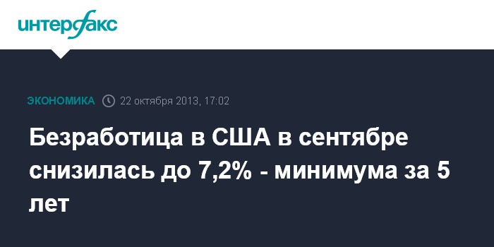 22 октября. FINMARKET.RU - Безработица в США в сентябре 2013 года снизилась до 7,2% - минимума с ноября 2008 года - против 7,3% в августе, свидетельствуют данные министерства труда страны. Аналитики, опрошенные агентством Bloomberg, не ожидали изменения показателя.