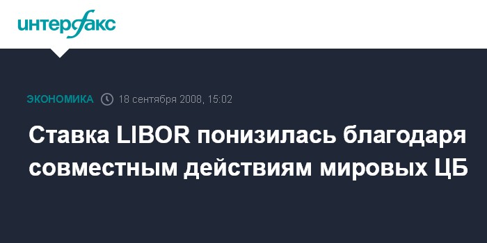Лондон. 18 сентября. INTERFAX.RU - Ставка LIBOR в долларах сроком overnight снизилась в четверг до 3,84% годовых с 5,03% накануне благодаря объявленным Федеральной резервной системой США, Европейским центральным банком и Банком Японии мерам, предпринятым для ослабления напряженности на рынках, сообщает агентство Bloomberg.