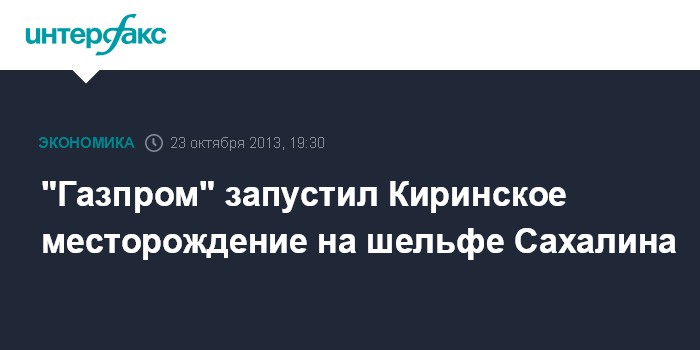 Москва. 23 октября. INTERFAX.RU - "Газпром" запустил в эксплуатацию Киринское газоконденсатное месторождение на шельфе Сахалина.
