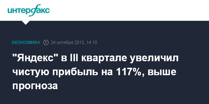 Москва. 24 октября. INTERFAX.RU - "Яндекс" в III квартале 2013 года увеличил выручку на 40% по сравнению с аналогичным периодом прошлого года, до 10,2 млрд рублей, говорится в сообщении компании.
