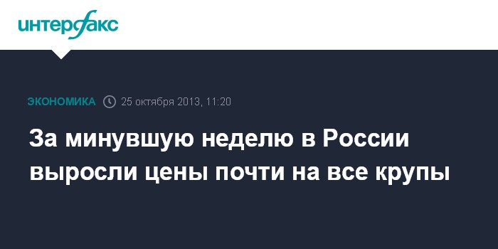 25 октября. INTERFAX.RU - В России ускорился рост цен на крупы. Больше всего за период с 11 по 18 октября подорожала гречневая крупа. Оптовая цена на нее повысилась сразу на 345 руб. - до 15 330 руб. за тонну. Рис подорожал на 250 руб. - до 23 155 руб., пшено - на 95 руб., до 10 920 рублей.