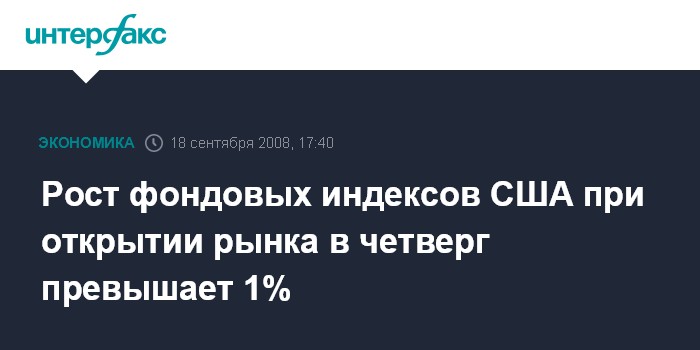 Москва. 18 сентября. INTERFAX.RU - Американский фондовый рынок открылся в четверг ростом индексов более чем на 1%, сообщило агентство Bloomberg.