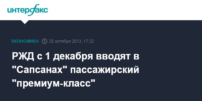 Москва. 25 октября. ИНТЕРФАКС - ОАО "Российские железные дороги"(РЖД) с 1 декабря вводит в высокоскоростных составах "Сапсан" премиальный класс обслуживания, сообщила пресс-служба РЖД.