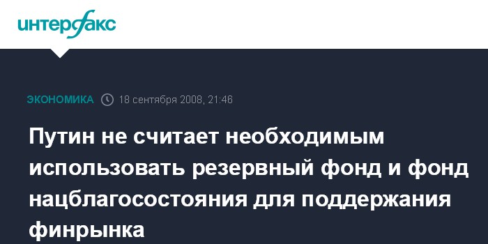Сочи. 18 сентября. ИНТЕРФАКС - Правительство РФ не видит необходимости в использовании средств резервного фонда для поддержания российского финансового рынка, заявил премьер-министр РФ Владимир Путин.
