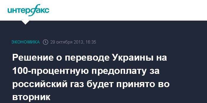 Москва. 29 октября. INTERFAX.RU - Украина нарушила график платежей, и после почти месячной просрочки "Газпром" стоит перед выбором, переводить ли Украину на 100-процентную предоплату, как это предусмотрено условиями контракта от 2009 года.