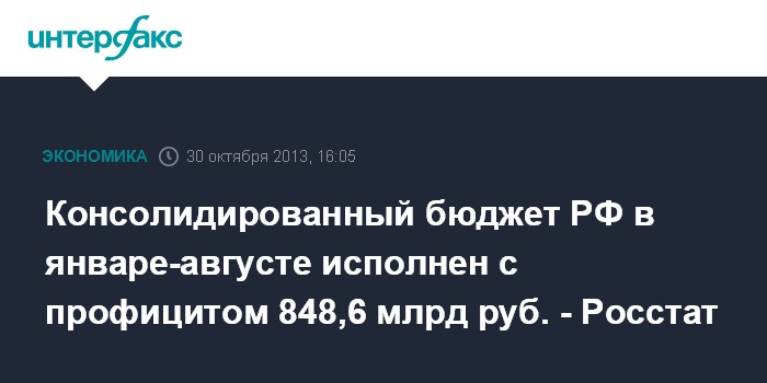Консолидированный бюджет РФ в январе-августе исполнен с профицитом 848,6 млрд руб. - Росстат