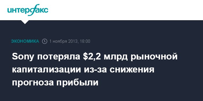 Токио. 1 ноября. INTERFAX.RU - Японская Sony Corp. потеряла $2,2 млрд рыночной капитализации после того, как руководство компании понизило прогноз чистой прибыли на 2013 фингод, который завершится в марте, и объявило об убытке в прошедшем квартале, сообщает агентство Bloomberg.