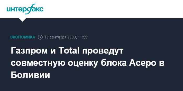 Москва. 19 сентября. INTERFAX.RU - ОАО "Газпром", боливийская госкомпания YPFB и Total E&P Bolivia подписали трехсторонний меморандум, который предполагает проведение совместной оценки блока Асеро.