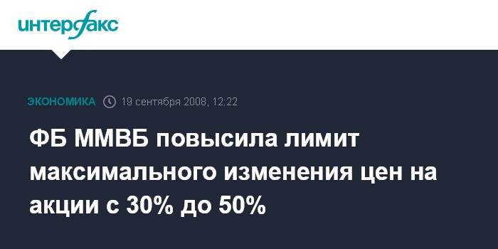 Москва. 19 сентября. NTERFAX.RU - ФБ ММВБ повысила лимит по максимально возможным изменениям цен на акции, которые торгуются в котировальных списках, с 30% до 50%, сообщил агентству "Интерфакс-АФИ" генеральный директор ФБ ММВБ Алексей Рыбников.