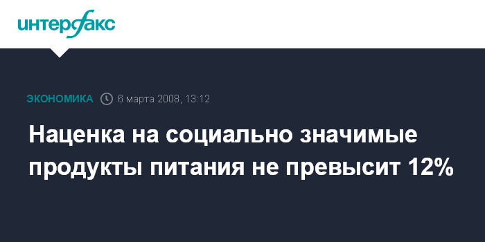 Москва. 6 марта. ИНТЕРФАКС - Министр сельского хозяйства РФ Алексей Гордеев на сегодняшнем брифинге по итогам заседании правительства заявил, что торговая наценка на социально значимые продукты питания не должна превышать 10-12%.