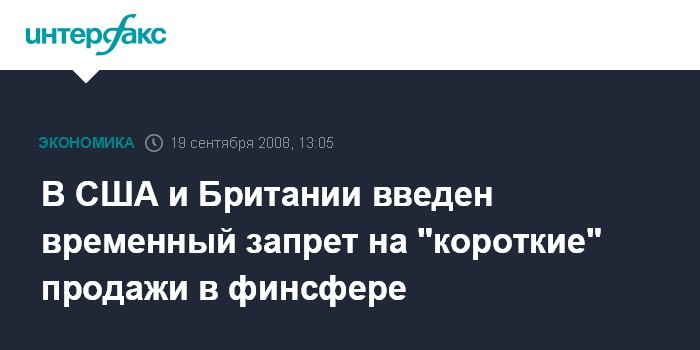 Запрет на такие операции с бумагами американских банков, страховых и брокерских компаний будет действовать до 2 октября. Управление по финансовым услугам Великобритании ввело запрет на "короткие" продажи акций финансовых фирм до конца 2008 года. Фондовый индекс Standard & Poor‘s 500 вырос после появления этого сообщения на 2,9%.
