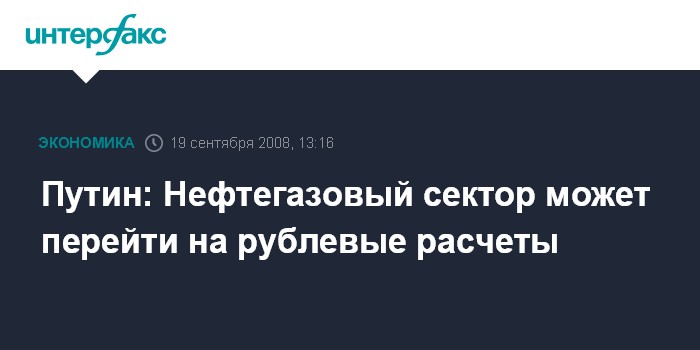 Москва. 19 сентября. INTERFAX.RU - Российский нефтегазовый сектор в ближайшей перспективе может перейти на расчеты в национальной валюте за реализуемую продукцию, заявил глава правительства РФ Владимир Путин.