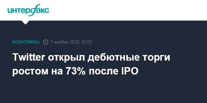 Нью-Йорк. 7 ноября. INTERFAX.RU - Twitter Inc., владеющая одноименным сервисом микроблогов, открыла дебютную сессию на Нью-йоркской фондовой бирже (NYSE) в четверг скачком на 73%.