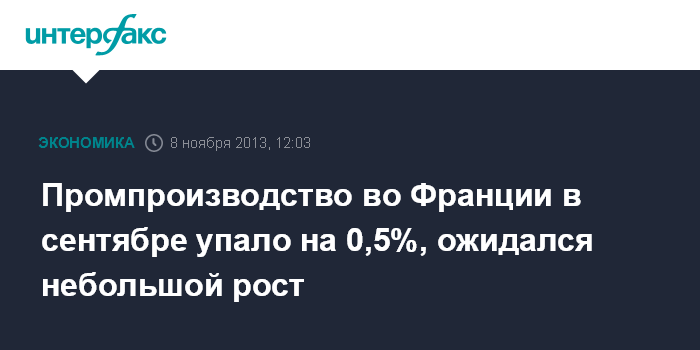 Производство в обрабатывающей промышленности Франции уменьшилось в сентябре на 0,7% относительно августа и упало на 1,3% по сравнению с сентябрем 2012 года. Эксперты прогнозировали повышение первого показателя на 0,4% и сокращение второго на 1,1%.
