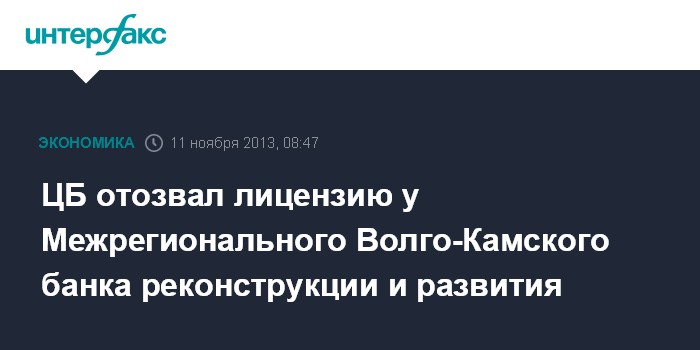 ЦБ отозвал лицензию у Межрегионального Волго-Камского банка реконструкции и развития