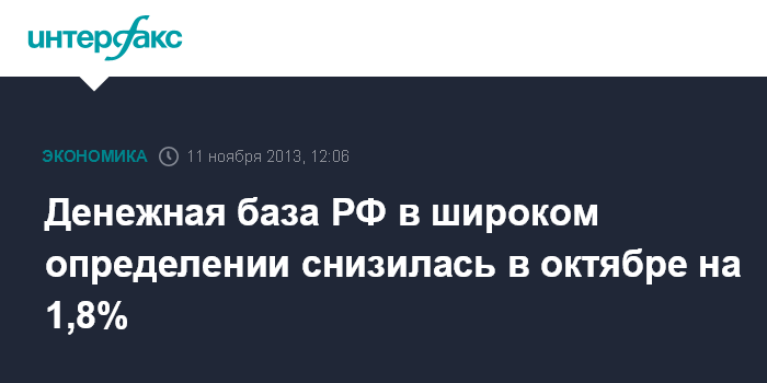 11 ноября. FINMARKET.RU - Денежная база РФ в широком определении снизилась за октябрь на 1,8% и на 1 ноября 2013 года составила 8 трлн 952 млрд руб., свидетельствуют данные ЦБ РФ. С начала года база сократилась на 9,1% (на 01.01.2013 - 9 трлн 852,8 млрд руб.).