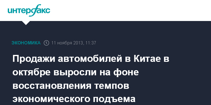 11 ноября. FINMARKET.RU - Продажи легковых автомобилей в Китае в октябре 2013 года увеличились на 24% по сравнению с аналогичным месяцем прошлого года - до 1,61 млн машин, свидетельствуют данные Китайской ассоциации автопроизводителей (CAAM).