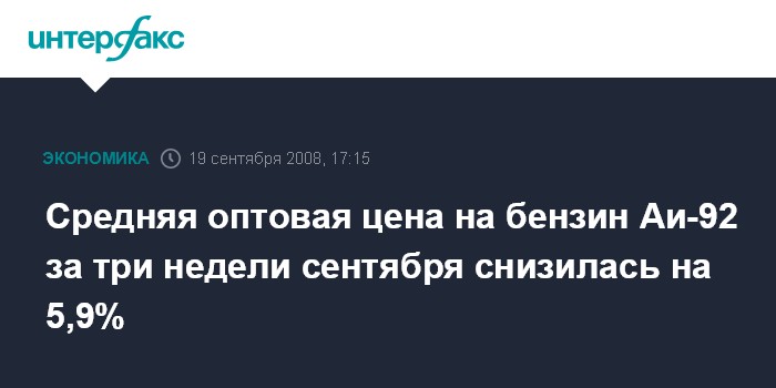 Москва. 19 сентября. INTERFAX.RU – Средняя оптовая цена на бензин марки Аи-92 на свободном рынке нефтепродуктов за 3 недели сентября снизилась на 5,9% и в настоящее время составляет 21,233 тыс. рублей за тонну.