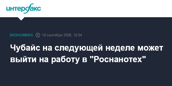 Москва. 19 сентября. INTERFAX.RU - Бывший председатель правления РАО "ЕЭС России" Анатолий Чубайс, потерявший работу 1 июля в результате ликвидации энергохолдинга в рамках реформы электроэнергетики страны, на следующей неделе может занять пост руководителя госкорпорации "Роснанотех", сообщили "Интерфаксу" источники, знакомые с ситуацией. "По моим данным, Чубайс выйдет на работу в "Роснанотех" в понедельник-вторник", - сказал один из источников.