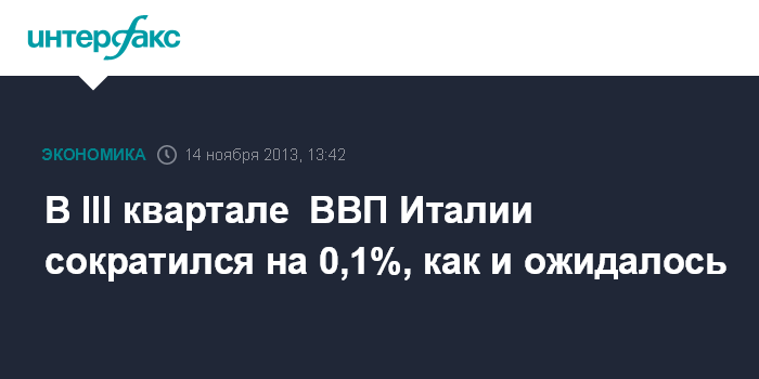 14 ноября. FINMARKET.RU - В третьем квартале 2013 года ВВП Италии сократился на 0,1% по сравнению с предыдущими тремя месяцами, когда наблюдалось его падение на 0,3%, свидетельствуют предварительные данные итальянского статистического агентства Istat.