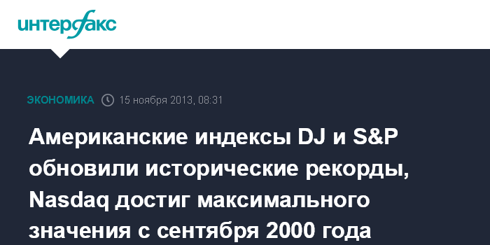15 ноября. FINMARKET.RU - По итогам торгов в четверг американские фондовые индексы выросли, причем Dow Jones Industrial Average и Standard & Poor's 500 обновили исторические рекорды, а Nasdaq достиг максимального значения с сентября 2000 года. Положительное влияние на рынок оказало выступление кандидата на пост председателя Федеральной резервной системы (ФРС) Джанет Йеллен, в котором инвесторы увидели сигналы о сохранении стимулирующей политики американского ЦБ, сообщил Bloomberg.