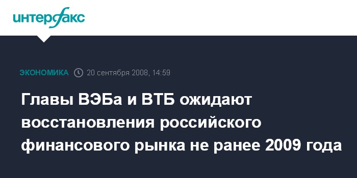 Москва. 20 сентября. INTERFAX.RU - Руководители Внешэкономбанка (ВЭБ) и ВТБ прогнозируют восстановление российского финансового рынка не ранее 2009 года.