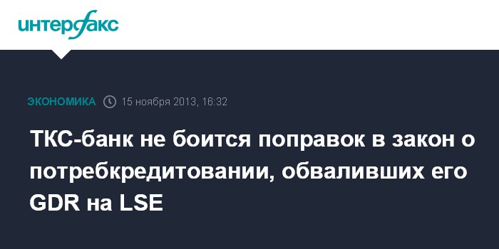 Москва. 15 ноября. INTERFAX.RU - ТКС-банк, GDR которого в пятницу пережили обвал на Лондонской фондовой бирже (LSE), верит, что поправки в закон о потребительском кредитовании не окажут сильного негативного влияния на деятельность банка, следует из официального сообщения банка.