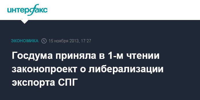Москва. 15 ноября. INTERFAX.RU - Госдума на пленарном заседании в пятницу приняла в первом чтении законопроект о либерализации экспорта сжиженного природного газа (СПГ).