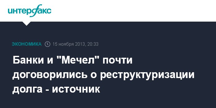 Москва. 15 ноября. INTERFAX.RU - Процесс переговоров о реструктуризации синдицированного кредита "Мечела" с банками практически завершен, сообщил источник.
