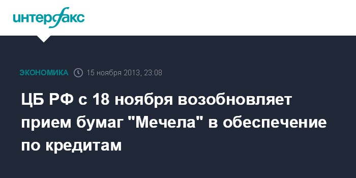 Москва. 15 ноября. ИНТЕРФАКС-АФИ - ЦБ РФ с 18 ноября 2013 года возобновляет использование ценных бумаг "Мечела" в качестве обеспечения в операциях предоставления ликвидности, говорится в сообщении пресс-службы ЦБ РФ.