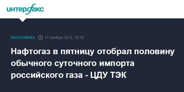 Москва. 17 ноября. INTERFAX.RU - "Нафтогаз Украины" в пятницу - первый день возобновления приема российского газа - импортировал примерно половину от тех объемов, что в среднем закупал в октябре. Объем закупки за газовые сутки 15 ноября составил 43,7 млн кубометров, свидетельствуют данные ЦДУ ТЭК.