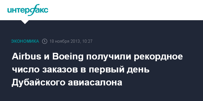 Дубай. 18 ноября. INTERFAX.RU - Airbus SAS и Boeing Co. получили рекордное количество заказов на самолеты в ходе первого дня Дубайского авиасалона-02013 (17 ноября), при этом основная часть заказов пришлась на долю авиакомпании Emirates - она подписала с авиастроительными концернами соглашения о покупке широкофюзеляжных самолетов на общую сумму более $100 млрд.