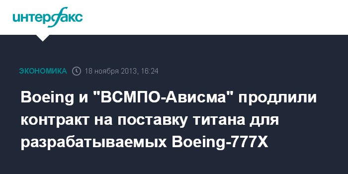 Москва. 18 ноября. INTERFAX.RU - "ВСМПО-Ависма" будет поставлять полуфабрикаты из титана для самолетов Boeing-777X, которые начинает разрабатывать американский производитель.