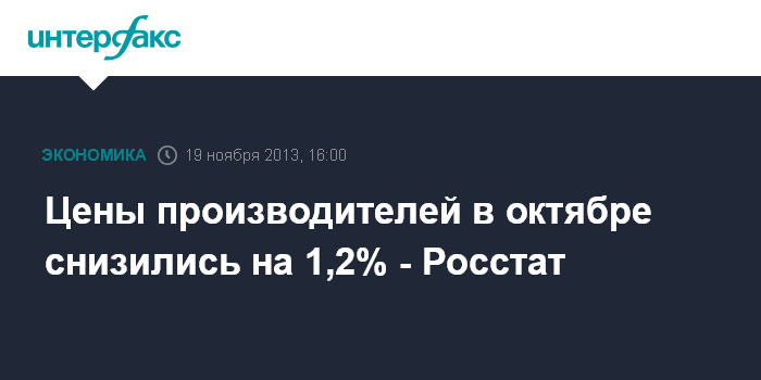 19 ноября. FINMARKET.RU - В октябре 2013 года цены производителей промышленных товаров снизились на 1,2% после роста на 1,4% в сентябре, свидетельствуют предварительные данные Федеральной службы госстатистики (Росстата).