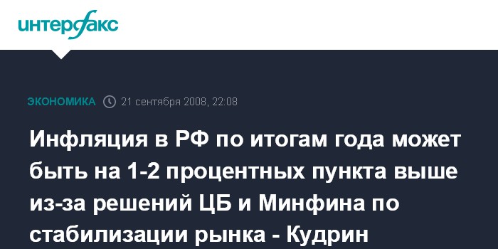 Москва. 21 сентября. ИНТЕРФАКС - Меры по поддержанию ликвидности на российском финансовом рынке, предпринятые в последние дни министерством финансов РФ и Центробанком, могут добавить к годовому показателю инфляции 1-2 процентных пункта, считает вице-премьер, глава Минфина Алексей Кудрин.