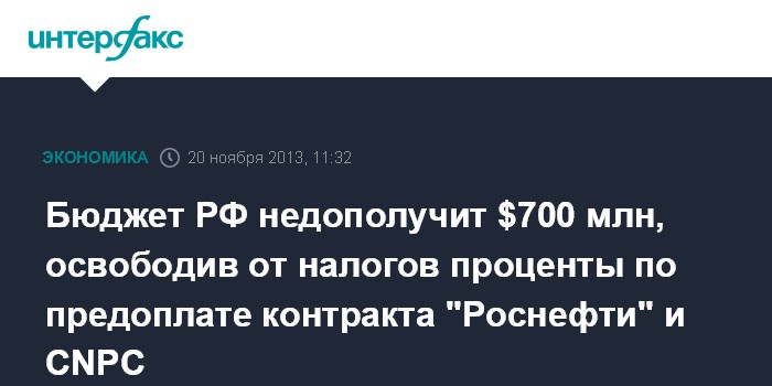 Москва. 20 ноября. INTERFAX.RU - Выпадающие доходы федерального бюджета России в виде неполученных налогов, связанных с освобождением от налогообложения процентов по предоплате, предоставляемой НК "Роснефть" по договорам с CNPC, за время действия соглашения между правительствами РФ и КНР составят ориентировочно не более $700 млн.