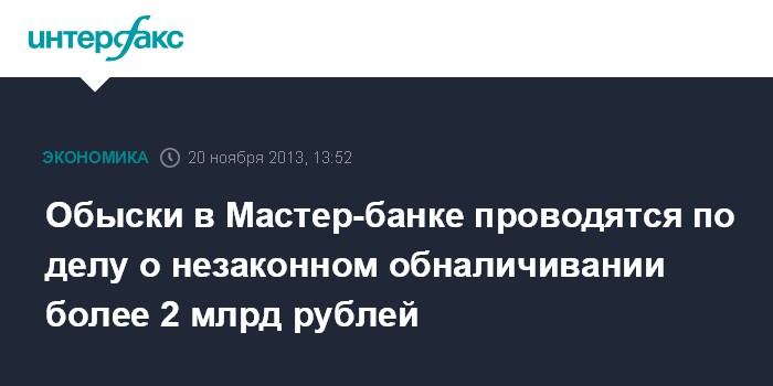 Москва. 20 ноября. INTERFAX.RU - Обыски в центральном офисе Мастер-банка в Москве проводятся в рамках уголовного дела о незаконной банковской деятельности, которое было возбуждено в отношении злоумышленников, подозреваемых в обналичивании более 2 млрд рублей, сообщили "Интерфаксу" в пресс-центре МВД РФ.