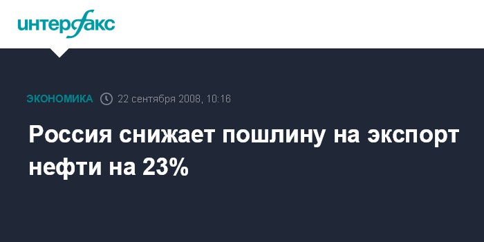 Москва. 22 сентября. INTERFAX.RU - Правительство РФ снижает с 1 октября пошлину на экспорт нефти с $485,8 до $372,2 за тонну. Соответствующее распоряжение от 19 сентября опубликовано в "Российской газете".
