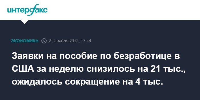 Заявки на пособие по безработице в США за неделю снизилось на 21 тыс., ожидалось сокращение на 4 тыс.