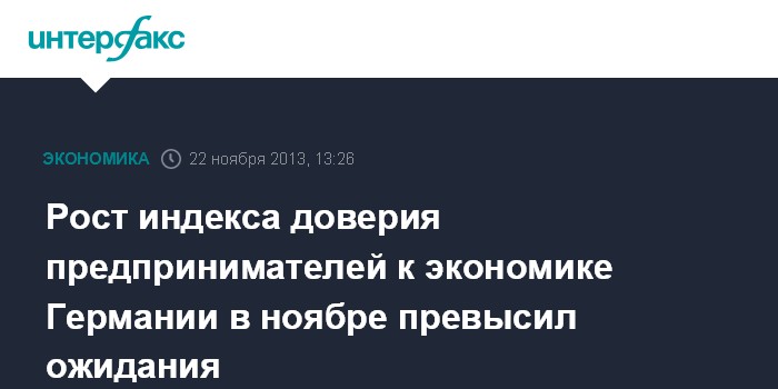 22 ноября. FINMARKET.RU - Индекс доверия германских предпринимателей к экономике страны вырос в ноябре 2013 года до 109,3 пункта со 107,4 пункта в октябре, свидетельствуют данные исследовательского института IFO.