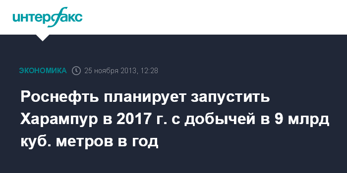 Роснефть планирует запустить Харампур в 2017 г. с добычей в 9 млрд куб. метров в год