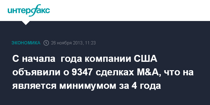С начала этого года американские компании объявили о 9347 сделках M&A, что на 16% меньше уровня того же периода годом ранее и является минимумом за 4 года.