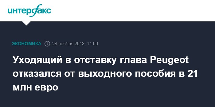Париж. 28 ноября. INTERFAX.RU - Уходящий в отставку гендиректор PSA Peugeot Citroen Филипп Варен отказался от права требования на выходное пособие в размере 21 млн евро из-за резко негативной реакции правительства Франции, которое вскоре может стать акционером проблемного автомобилестроительного концерна, пишет The Wall Street Journal.