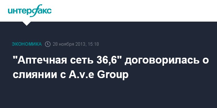 Москва. 28 ноября. INTERFAX.RU - "Аптечная сеть 36,6" договорилась о слиянии с аптечной сетью A.v.e Group (ООО "Аптека-А.в.е"), сообщила "Аптечная сеть 36,6".