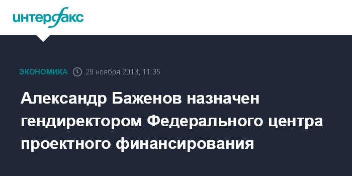 Москва. 29 ноября. INTERFAX.RU - Глава дирекции государственно-частного партнерства Внешэкономбанка Александр Баженов назначен гендиректором ОАО "Федеральный центр проектного финансирования" (ФЦПФ, 100% "дочка" ВЭБа).
