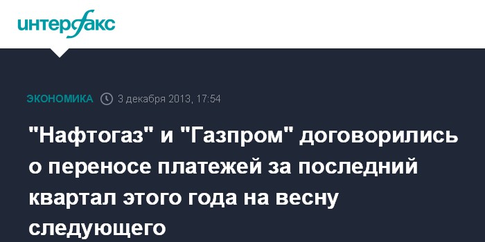 Киев. 3 декабря. INTERFAX.RU - НАК "Нафтогаз Украины" и российский "Газпром" договорились о переносе платы за потребленный Украиной в октябре - декабре 2013 года газ на весну 2014 года, заявил председатель правления "Нафтогаза" Евгений Бакулин.